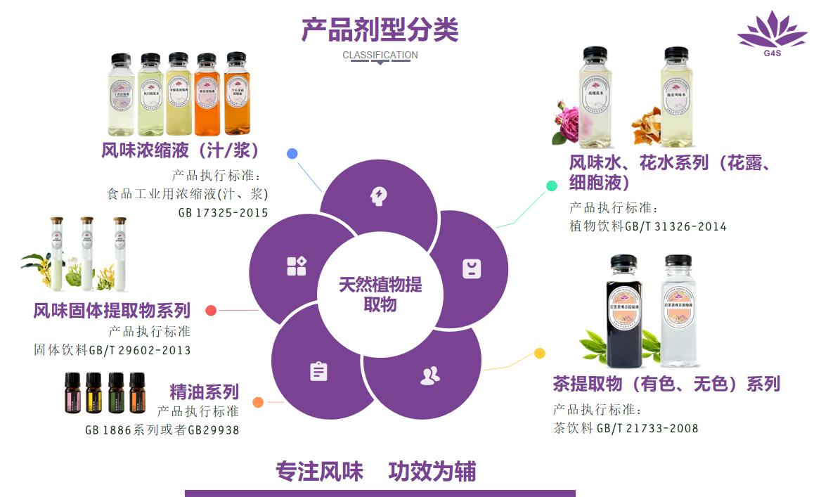 1.公司天然提取物产品专注风味,功效为辅,主要有以下产品剂型分类:风味浓缩液(汁/浆)风味水、花水系列(花露、细胞液)风味固体提取物系列茶提取物(有色、无色)系列 精油系列。